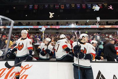 Just 2:30 into the first period, Firebirds forward Oscar Molgaard lit the lamp, immediately prompting fans to shower the ice with thousands of teddy bears and stuffed animals in one of the most heartwarming traditions in hockey. The celebration brought play to a pause as players, staff, and volunteers helped clear the ice following the plethora of plushies littering the playing surface.
