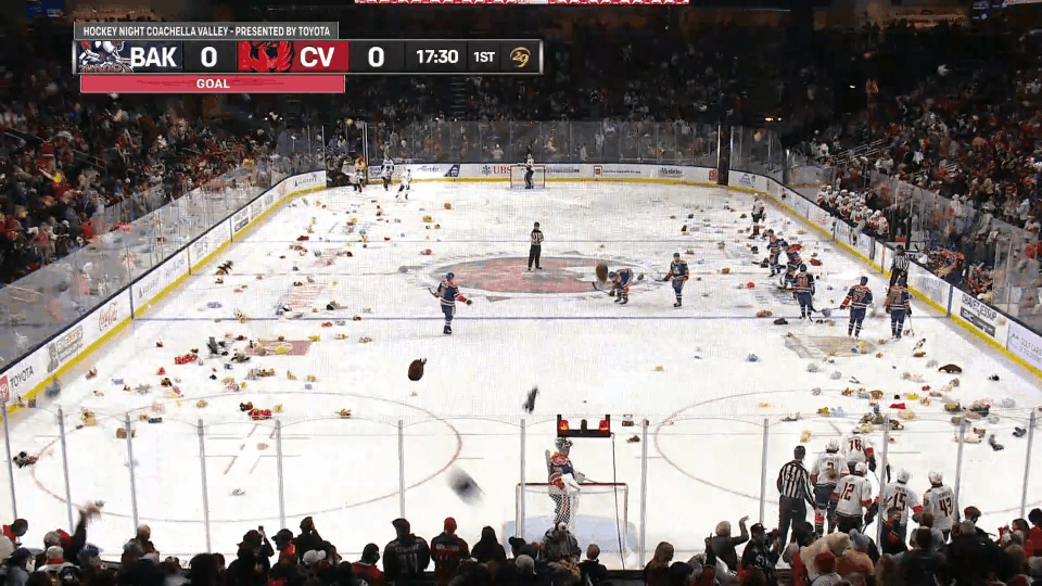 A single goal turned into a tidal wave of generosity on Friday night at Acrisure Arena, as Coachella Valley Firebirds fans helped collect 22,029 teddy bears during the team’s fourth annual Teddy Bear Toss Night, presented by The General Air Conditioning and Plumbing. The highly anticipated annual event, part of the organization’s Season of Giving events, supports local first responders from police, fire, EMT, and other emergency services and community outlets, who in turn, can provide stuffed animals to children as a means of comfort and support during emergency calls.